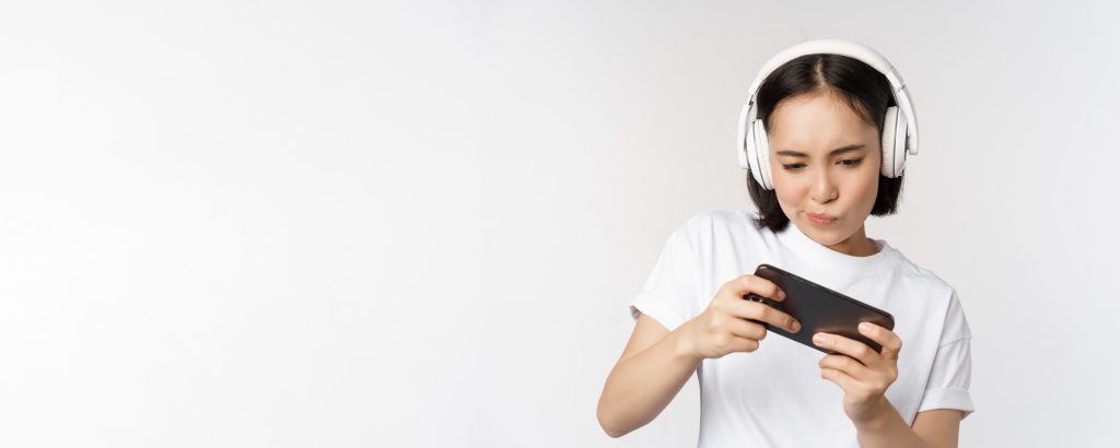 Happy asian woman in headphones, looking at smartphone, watching video on mobile phone and smiling, standing over white background.
